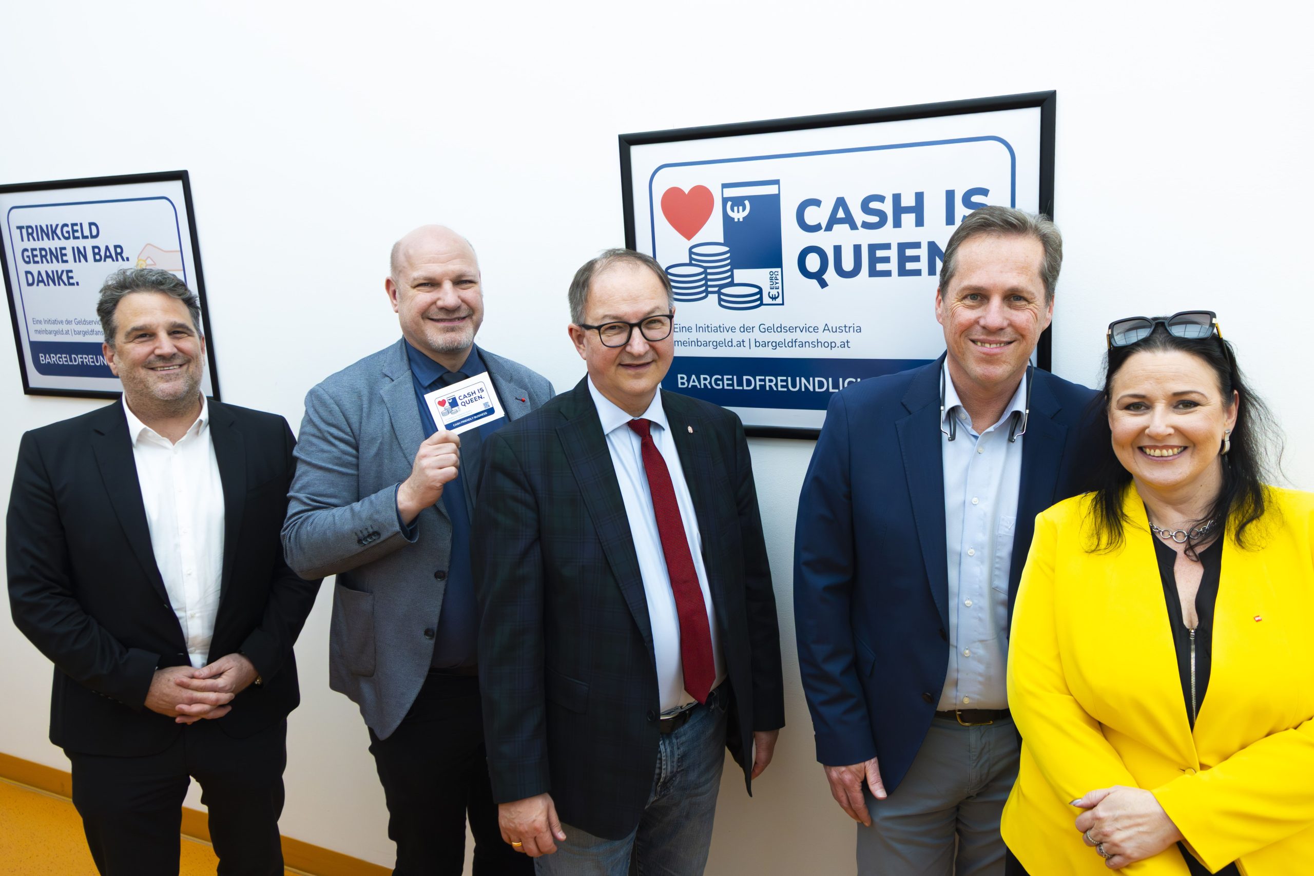 LHStvtr. Reinhold Entholzer, Labg. Sabine Promberger und die Bürgermeister der veranstaltenden Gemeinden Obertraun und Hallstatt, Egon Höll und Alexander Scheutz gratulieren der ältesten Teilnehmerin an der Wanderung.